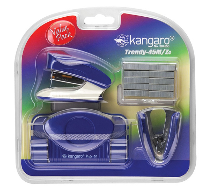 ergonomiczny zestaw 4 produktów: - dziurkacz do papieru Perfo-10 do 10 kartek - zszywacz Trendy 45M do 15 kartek, - rozszywacz, - pudełeczko zszywek 24/6 atrakcyjne opakowanie typu blister do użytku w biurze i w domu 10 lat gwarancji kolor niebieski