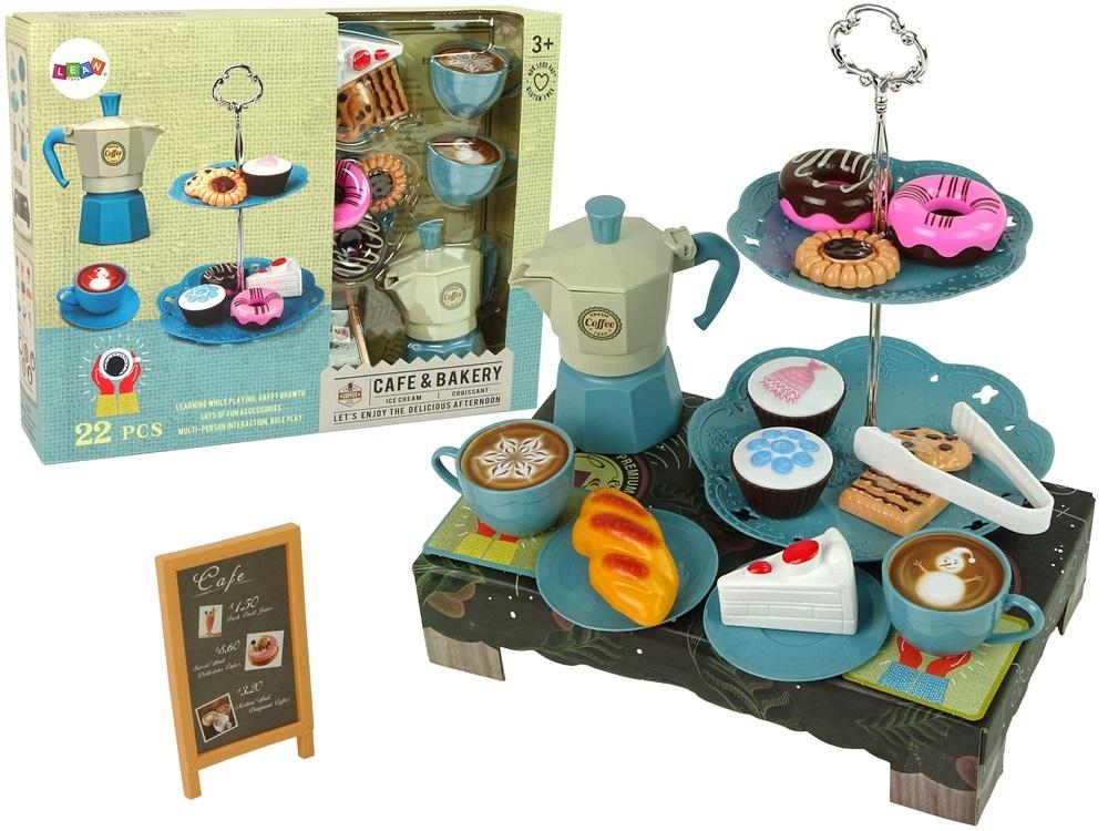 Zestaw wykonany został w pięknej kolorystyce, a ciasteczka i donuty wyglądają apetycznie. Serwis posiada także różne wzory nakładek na kawę, maluch może zostać profesjonalnym baristą i serwować kawę z różnymi wzorami. Dwupoziomowa patera pozwoli ułożenie wszystkich słodkości, aby pięknie się prezentowały. Tabliczka natomiast z dostępnymi słodyczami będzie jednym z akcesoriów potrzebnych do zabawy w kawiarnie. Czas na zabawę.