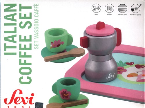 Komplet zawiera drewnianą tacę, na której możemy położyć 2 filiżanki ze spodkami i łyżeczkami, cukiernicę i dzbanek na mleko. Dodatkowo kawiarka Sevi do parzenia kawy jest rozkręcana. Zestaw w pastelowych kolorach Wiek: 2+
