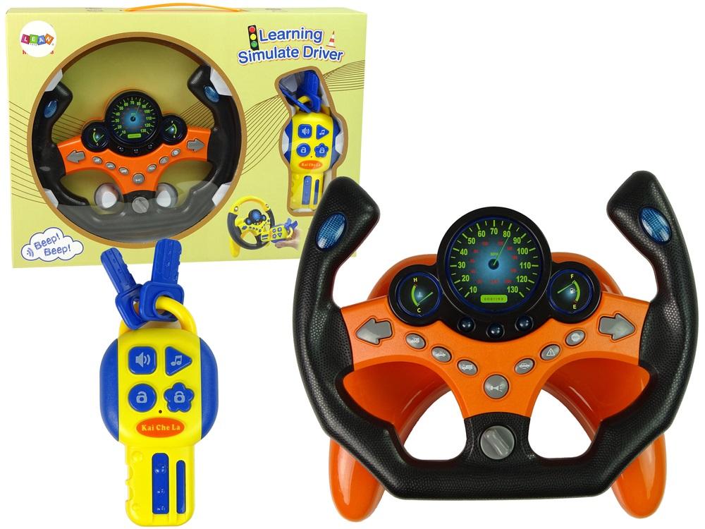 Zestaw Kierowcy Kierownica Kluczyki Dźwięk Światła Pomarańczowy Interaktywna kierownica to niesamowity prezent dla każdego dziecka, które chce się sprawdzić w roli kierowcy. Zabawka sprawia mnóstwo frajdy, ale także wpływa pozytywnie na rozwój malucha. Ćwiczy koordynację ręka-oko, rozwija kreatywność malucha, poznaje podstawowe funkcje samochodu oraz poprawia koncentrację. Kierownica jest w kolorystyce żółto- czarnej. Cała kierownica ma 9 przycisków w tym dwa kierunkowskazy, klakson oraz sygnały służb ratunkowych. Wystarczy, że przekręci kluczyk startu i może rozpocząć zabawę ! Zegary na kierownicy podświetlają się na niebiesko. Wygląd oraz diody sprawią, że maluch poczuje się jak na prawdziwej ulicy, prowadząc swoje autko. Kierownica pasuje idealnie do rączki malucha, podstawka posiada przyssawki, należy przymocować ją do stołu i cieszyć się zabawą! Czas na symulacje jazdy w wykonaniu Twojego dziecka. W zestawie znajdują się także kluczyki, kierownice można uruchomić przez wnękę w kluczyku. Naciskając przycisk kłódki, usłyszymy dźwięk otwierania, bądź zamykania, pozostałe odpowiadają za głośność i melodie. Zabawa da wiele radości oraz zainteresuje maluch w trakcie jazdy. Wymiary kierownicy: 24 cm x 20 cm x 4 cm z podstawką: 24 cm x 24 cm x 10 cm Wymiary kluczyków: 14 cm x 8 cm x 4 cm Wymiary opakowania: 41 cm x 30 cm x 10 cm Prezentowana zabawka przeznaczona jest dla wszystkich dzieci powyżej 3 roku życia. Wykonana jest z bezpiecznych dla maluszków, atestowanych materiałów, dzięki czemu posiada certyfikat CE. Zestaw bardzo efektownie i estetycznie wykonany. By dziecko mogło korzystać ze wszystkich funkcji zabawki, należy umieścić w niej trzy sztuki baterii AA 1,5 V do kierownicy, dwie sztuki AA 1,5 V do kluczyków, które nie są dołączone do zestawu.