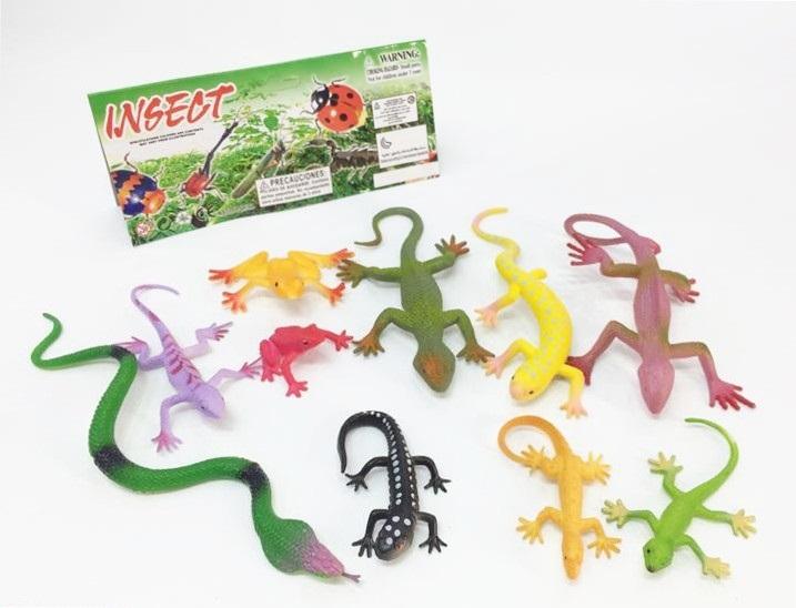 Zestaw 10 kolorowych płazów (żaby) i gadów (jaszczurki). Produkt zapakowany w przezroczysty worek. Produkt przeznaczony dla dzieci od 3 lat. Podane wymiary są wymiarami opakowania.
