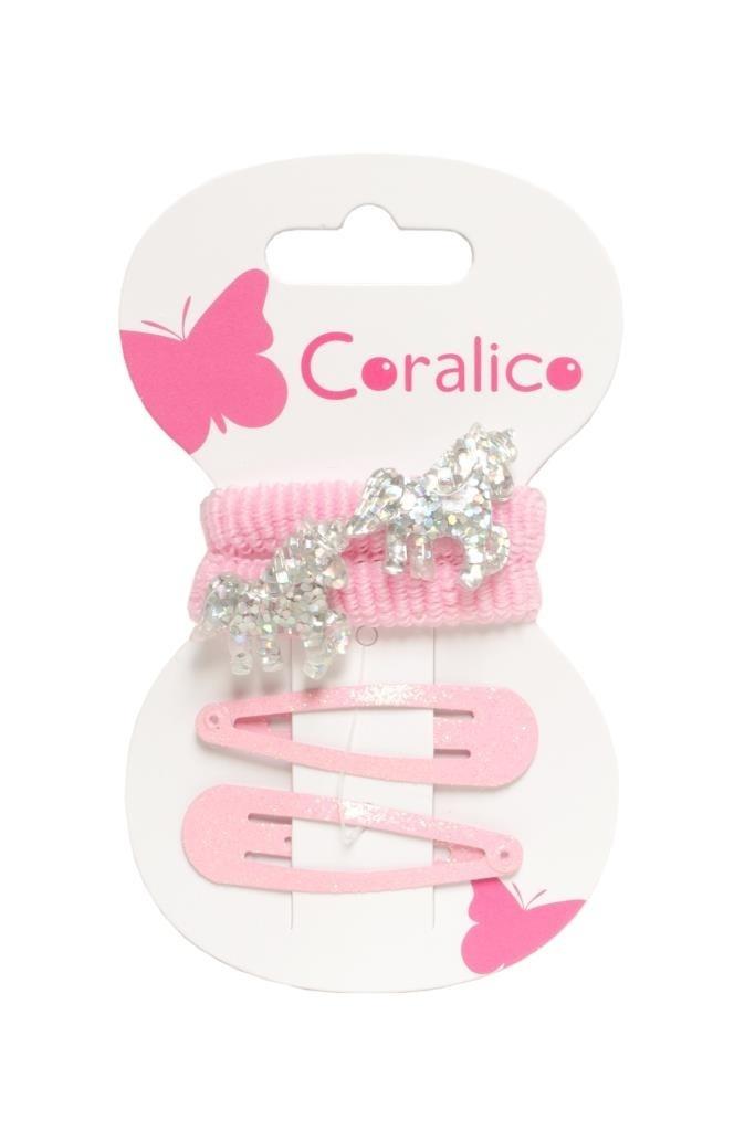 Zestaw frotek i spinek w kolorze różowym. Motyw konika na frotkach wykonany z mieniącego się tworzywa