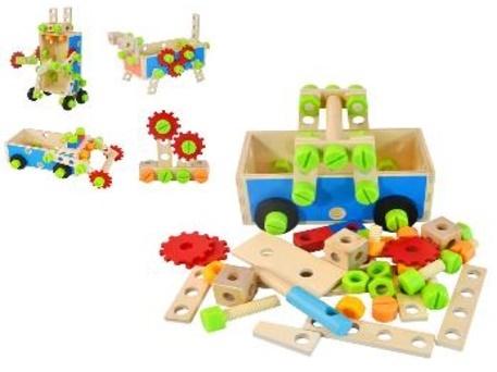 W zestawie: skrzynka na elementy, zestaw elementów konstrukcyjnych w tym koła zębate, deseczki, nakrętki, śrubki, śrubokręty.