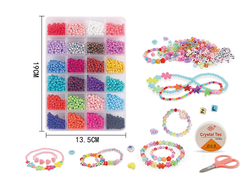 Koraliki zapakowane w plastikowy pojemnik, z 24 przegródkami, w każdej z nich inny kolor koralików.