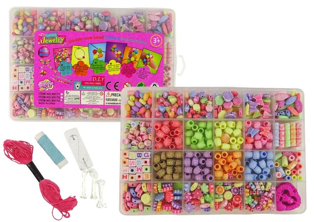 Zestaw składa się z 24 różnych wzorów koralików. Wybór jest ogromny, w różnych kolorach i wzorach, kwiatki, kuleczki, literki. Do zestawu dołączone są sznurki, na które wystarczy nawlec koraliki. Dziewczynka będzie mogła stworzyć swoją wymarzoną bransoletkę z koralików bądź z imieniem. A kto wie, może sprawi najcenniejszy prezent mamie lub babci? Wykonaną od serca biżuterią.