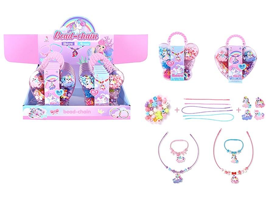 Opis: 12 szt/disp, 2 wzory do wyboru, w zestawie: 6 rodzajów koralików, 4 przywieszki z jednorożcami, 2 linki z zapięciem na szyję, 2 linki z zapięciem na nadgarstek, pojemnik na koraliki z rączką, wym. opak. 14 x 16,3 x 1,8 cm, wym. disp.31 x 14,2 x 23,8 cm, 3+
