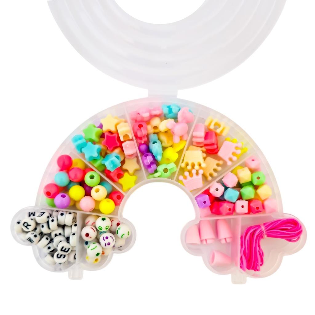 Zestaw koralików DIY. Tęcza Materiał: polimer, tworzywo sztuczne. W zestawie: żyłka, koraliki w różnych kształtach i kolorach, koraliki literki.