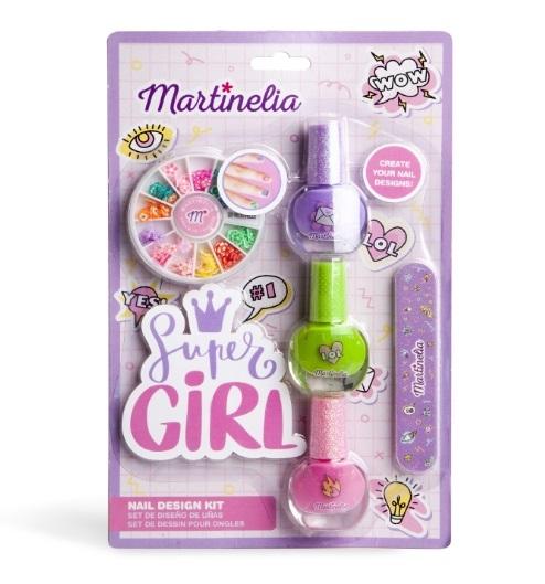 Zestaw kosmetyków do paznokci dla dzieci zawiera: 3 lakiery do paznokci, zestaw ozdób do paznokci, pilnik, patyczek do paznokci.