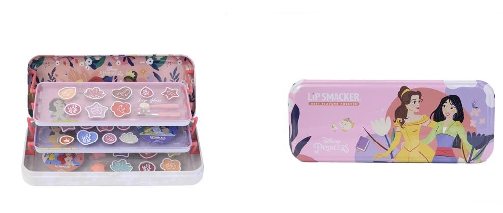 Trzypoziomowe metalowe etui z kosmetykami dla dzieci księżniczka zawiera: