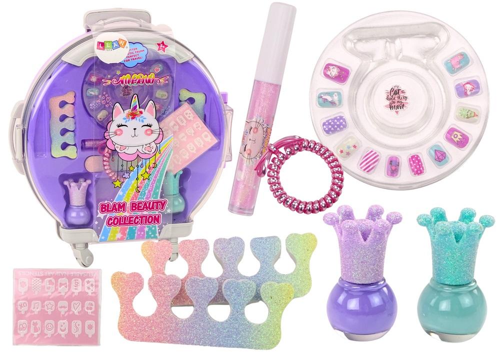 Zestaw Kosmetyków W Walizce Do Paznokci Makijażu Walizka Fioletowa 9 El. Zestaw do makijażu i zdobień paznokci dla dzieci, zapakowany jest w uroczą, fioletową walizkę z kółkami oraz z wygodną rączką do trzymania, która sprawia, że jest jak prawdziwa walizka, idealna do podróży. Nasz zestaw zawiera wszystko, czego Twoje dziecko potrzebuje, aby zanurzyć się w fascynującym świecie makijażu i zdobień paznokci. Paleta tipsów zawiera 12 sztuk w różnych kolorach oraz wielkościach, pozwalając na idealne dopasowanie do dziecięcych paznokci. Dzięki temu Twoje dziecko może stworzyć niezliczone kombinacje, aby wyrazić swój styl i kreatywność. Dodatkowo w zestawie znajduje się pilnik do paznokci oraz urocze, kolorowe oraz brokatowe separatory kosmetyczne. Dwa lakiery do paznokci - fioletowy i zielony - pozwolą Twojemu dziecku stworzyć magiczne wzory na swoich paznokciach. Zakrętki do lakierów w kształcie korony dodają niezwykłego uroku. To jednak nie koniec! Nasz zestaw zawiera również błyszczyk do ust, aby dodać małej artystce trochę blasku i uroku, gumkę do włosów oraz naklejki na paznokcie, które umożliwiają stworzenie wyjątkowych wzorów i zdobień. Walizka wykonana z wysokiej jakości tworzywa sztucznego, ma wymiary 27 cm x 30 cm x 8 cm, co sprawia, że jest idealna do przechowywania wszystkich tych magicznych produktów i łatwa do zabrania w podróż. Dzięki temu zestawowi Twoje dziecko może się bawić, eksperymentować i wyrażać siebie w świecie makijażu i zdobień paznokci, czując się jak prawdziwa mała artystka! Elementy zestawu: - paletka tipsów - 2 separatory kosmetyczne - gumka do włosów - naklejki na paznokcie - 2 lakiery do paznokci - pilniczek - błyszczyk Wymiary opakowania: 27 cm x 30 cm x 8 cm Posiada certyfikat CE, ponadto jest zgodny z normą EN71. Przeznaczony dla dzieci powyżej 3 roku życia.