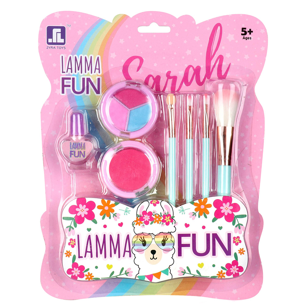 Zestaw składa się z lakieru do paznokci, błyszczyka oraz cieni do powiek wraz z czterema pędzelkami do nakładania ich. Wymiary opakowania: 21,2 x 2,5 x 26,7 cm.