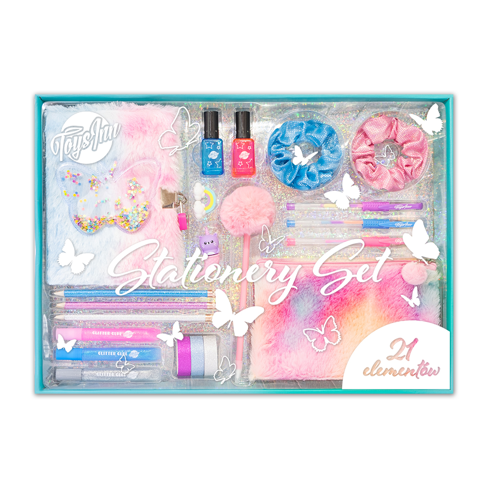 Zestaw 10 w 1 do doskonały przezent, który miło zaskoczy i sprawi radość każdej dziewczynce. Zestaw zawiera aż 10 elementów: pamiętnik na kłódkę z pluszową okładką, pluszowy piórnik, długopis z pomponem, 3 kleje brokatowe, 3 długopisy żelowe, 3 ołówki w brokatowej obudowie, 3 taśmy klejące, 2 zakreślacze, 2 gumki do włosów scrunchies.