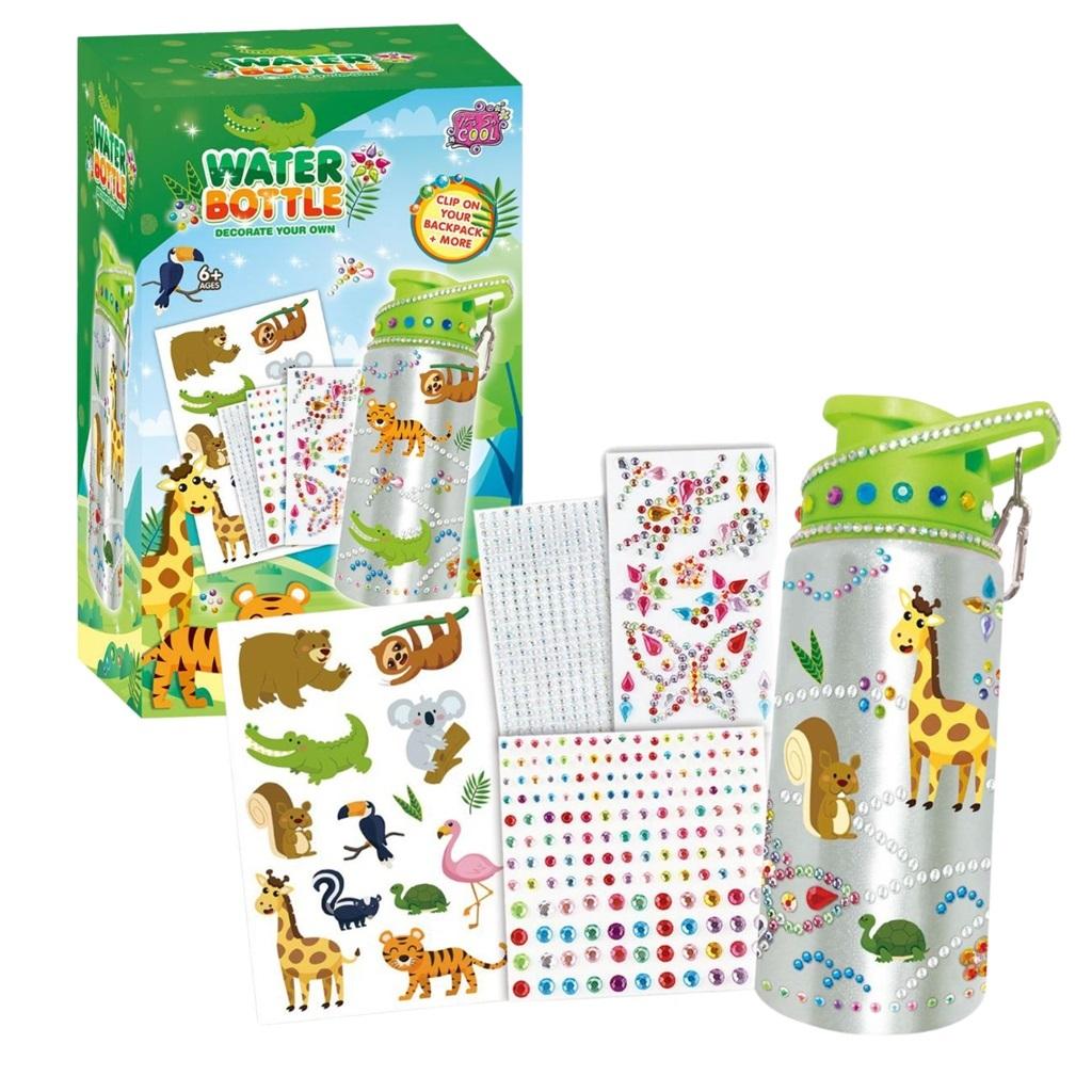 Zestaw zawiera butelkę na wodę, naklejki oraz diamenciki. Wystarczy oderwać naklejkę z wybranym wzorem i przykleić do butelki. Dzięki temu dzieci mają szansę na tworzenie różnorodnych kompozycji, układając wybrane wzory.