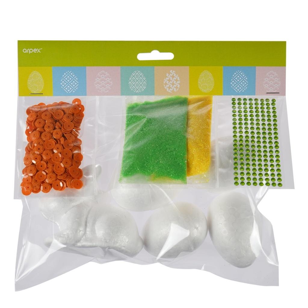 Zestaw do samodzielnego wykonania dekoracji wielkanocnych. Kreatywny zestaw do prac DIY. W skład zestawu wchodzą: - 2 jajka styropianowe 7cm - 2 jajka styropianowe 6cm - zajączek styropianowy 10cm - brokat 10 g x 2 kolory - cekiny dekoracyjne mix kolorów - kryształki samoprzylepne na arkuszu, mix. kolorów - 160 szt. Zestaw idealny do wspólnej zabawy z dziećmi, rozwijania kreatywnego myślenia i precyzyjnego działania