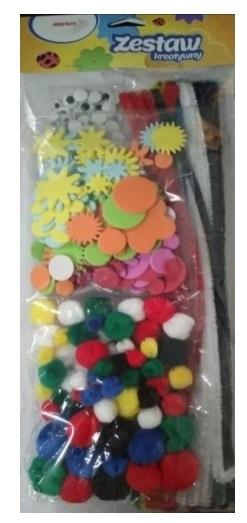 Zestaw kreatywny duży zawartość: pompony - 39 szt naklejki z pianki - 36 szt ruchome oczy - 20 szt druciki kreatywne - 20 szt