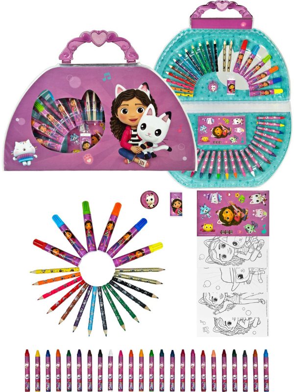 Zestaw kreatywny, który zachwyci każdego małego artystę. W opakowaniu znajdziemy mnóstwo akcesoriów artystycznych z motywem graficznym nawiązującym do postaci z bajki "Koci Domek Gabi". Wszystkie elementy znajdują się w wygodnym opakowaniu z rączką. Zawartość : 12 kredek ołówkowych, 24 kredki świecowe, 6 flamastrów, 4 karteczki z kolorowania, arkusz naklejek, 2 ołówki, gumka, temperówka.