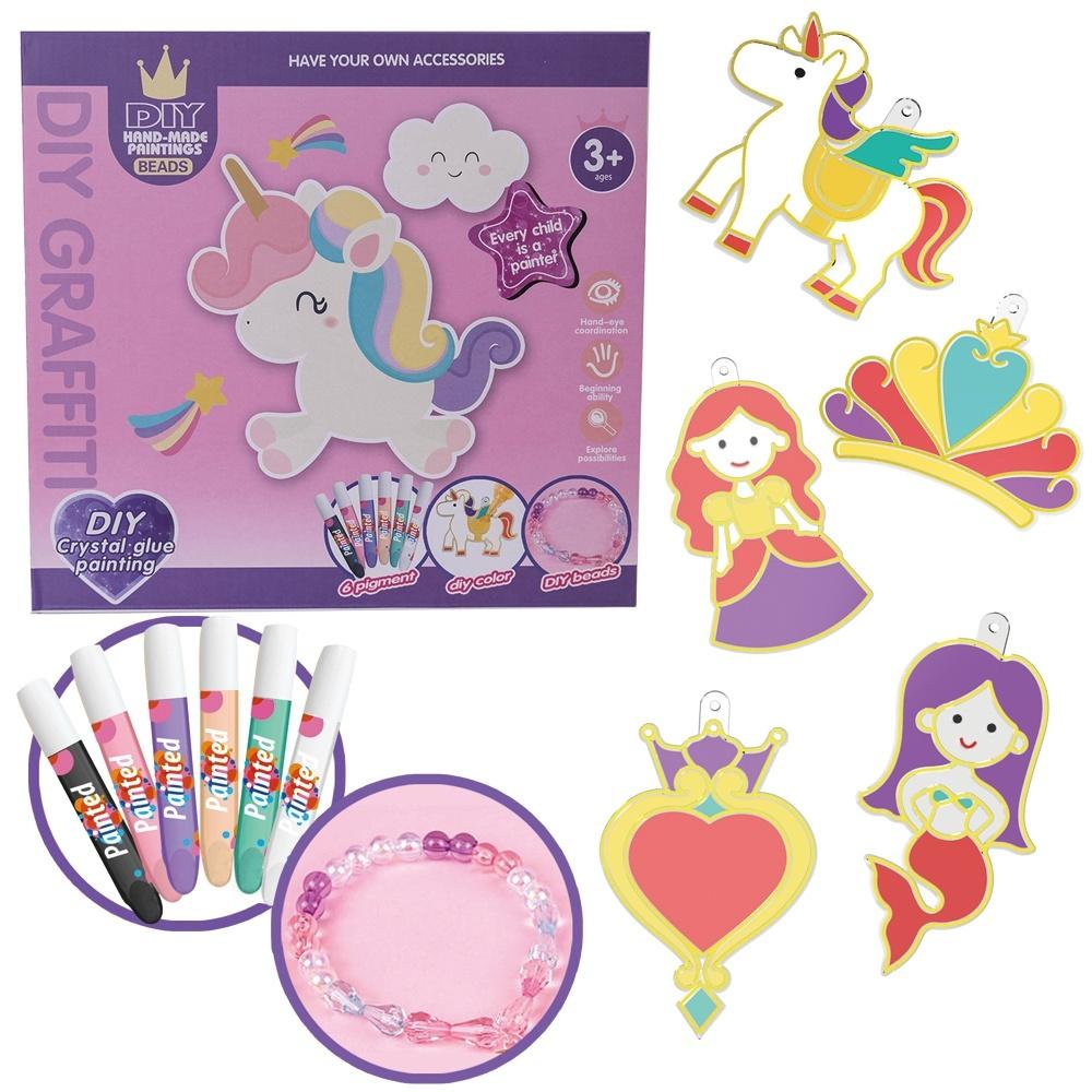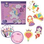 Zestaw kreatywny – KSIĘŻNICZKI Super zestaw dla małej artystki. Dziecko może stworzyć ozdobę plecaka, piórnika czy kurtki. Może także stworzyć bransoletkę czy piękny naszyjnik. W zestawie 6 elementów tematycznych do dekoracji, 6 farbek, zestaw kolorowych dżetów, łańcuszki, koraliki, żyłka, pęseta. Wymiary opakowania: 24.5 x 3.5 x 23 cm Wiek 3+