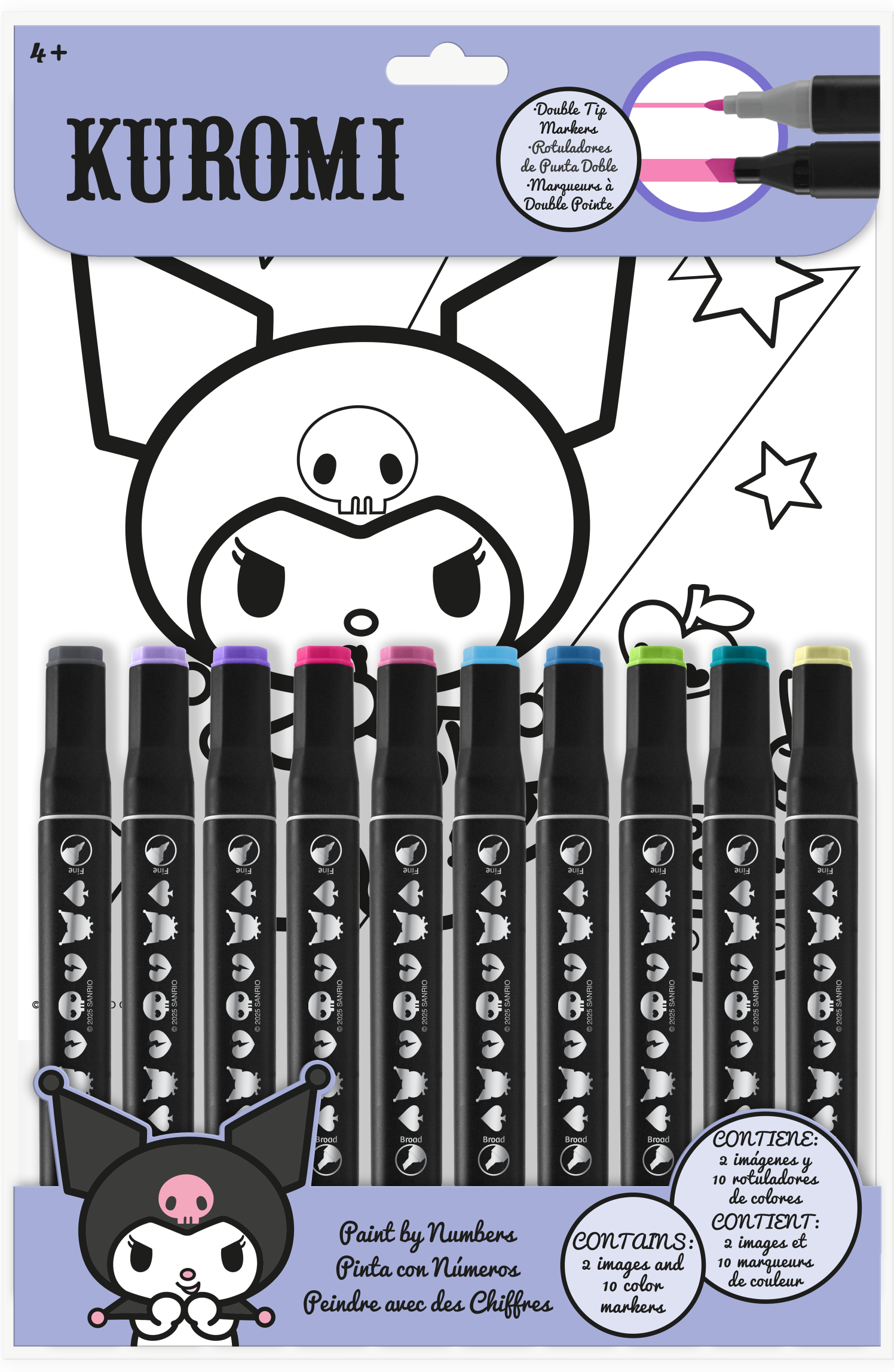 Zestaw kreatywny Kuromi to bogaty zestaw do kreatywnej zabawy dla dziecka. • 10 dwustronnych flamastrów• Wymiary: 29x23x1,3 cm• Materiał: PVC, papier• Zawartość : 2 kartki do rysowania po numerkach