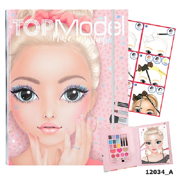 Zestaw kreatywny Make Up TOP Model, zestaw w teczce, zamykany na gumkę, w środku 32 szablony do projektowania makijażu i fryzur. Dodatkowo paleta z kosmetykami: 9 cieni, 3 kredki, 3 róże, 4 błyszczyki i 4 różne pędzelki