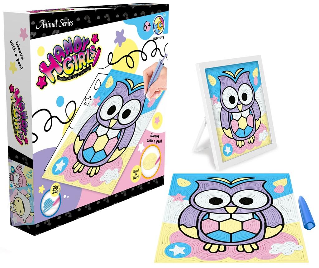 W zestawie kreatywny obrazek - o strukturze "rzepa", zestaw kolorowych włóczek i specjalne "pióro" do włóczki. Za pomocą pióra, dziecko wypełnia obrazek kolorowymi włóczkami tworząc piękne dzieło. Obrazki posiadają różne wzory.