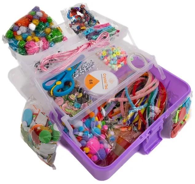 duży zestaw kreatywny w pudełku, zawiera kolorowe papiery, nożyczki, taśmę dwustronną, gumowy i tekstylny sznurek do beadingu, pompony, pompony z frędzlami, dużą paczkę drucików, piórka, patyczki kreatywne, guziczki, naklejki piankowe - literki, kwiatki, zwierzątka, samoprzylepne oczy, samoprzylepne kamienie, koraliki, cekiny.