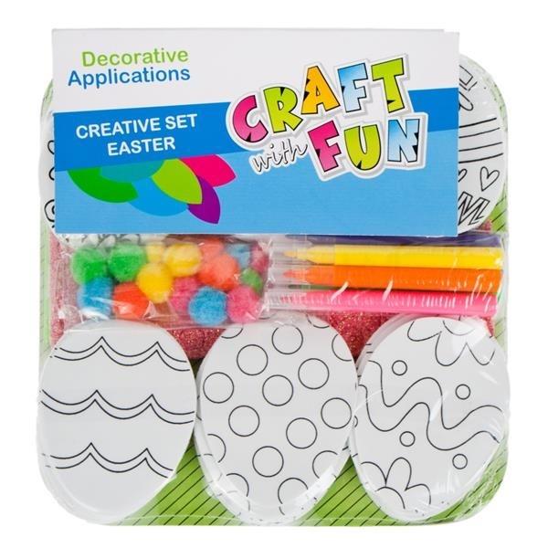 Zestaw kreatywny od Craft with Fun korzystnie wpływa na rozwój zdolności manualnych, kreatywności oraz wyobraźni, zapewniając mnóstwo wspaniałej zabawy połączonej z nauką. Używaj tych produktów w połączeniu z innymi akcesoriami z serii Craft With Fun lub z innymi kompletami z serii! Kreatywny zestaw do stworzenia Pisanek. Zestaw zawiera 54 elementy: piankowe pisanki do zdobienia, trzy kolory pisaków oraz akcesoria do zdobienia pisanek. Wszystkie elementy wykonane z pianki oraz materiałów. Przeznaczone dla dzieci od lat:3+. Pakowane w folię z zawieszką. Wymiary opakowania (szer. x wys.) [cm]: 18x20.