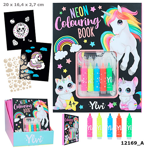 Kolorowanka z neonowymi flamastrami Jednorożec 5 kolorów. W zestawie kolorowanka (ok.25 stron), 1 strona z naklejkami, 5 neonowych flamastrów: różowy, żółty, czerwony, niebieski, zielony).