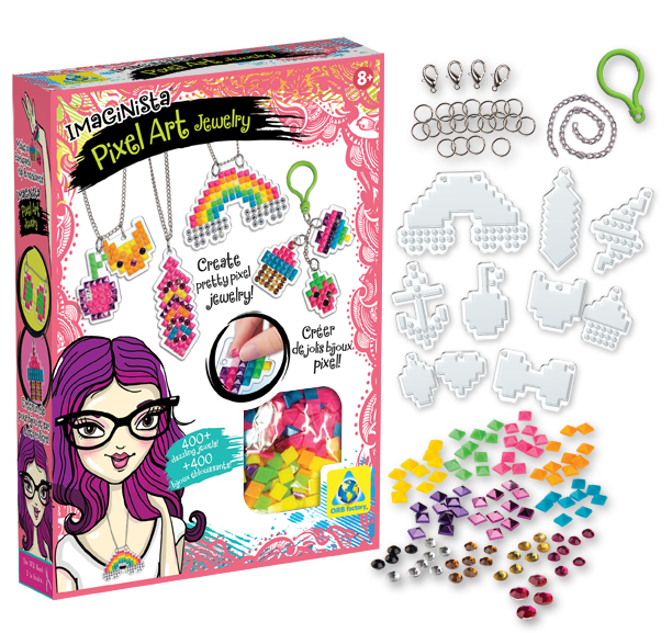 Zestaw kreatywny do tworzenia biżuterii z kolorowych kwadracików, które nakleja się na plastikowe przezroczyste elementy bizuteri wg własnego pomysłu. Nastęnie należy dołączyć zapięcia, haczyki aby stworzyć wybrany element biżuterii.
