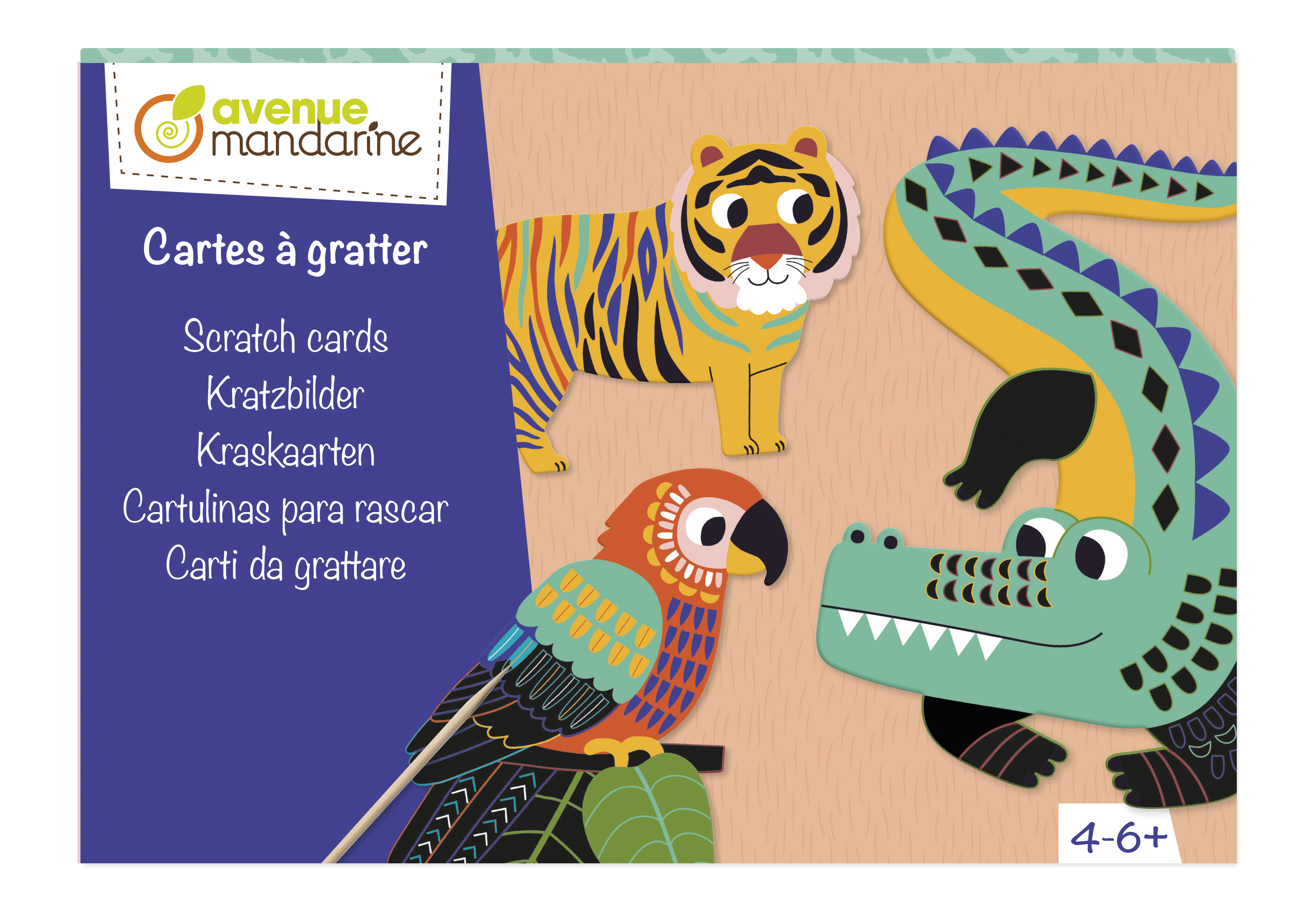 Zestaw zawiera: 5 kart / zdrapek w kształcie zwierząt 15x21cm + 1 drewniany patyczek + instrukcja