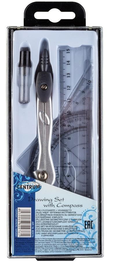 Zestaw kreślarski: cyrkiel, rysiki, 2 ekierki, linijka 15cm, kątomierz