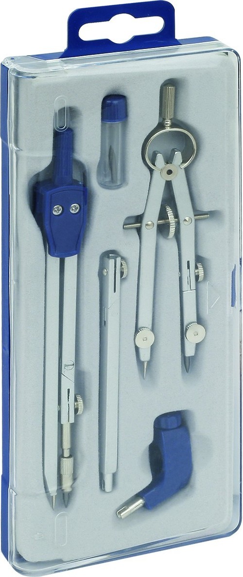 5 elementów w zestawie: cyrkiel 136 mm, zerownik, końcówka cyrkla z uchwytem uniwersalnym, przedłużacz, wymienny grafit