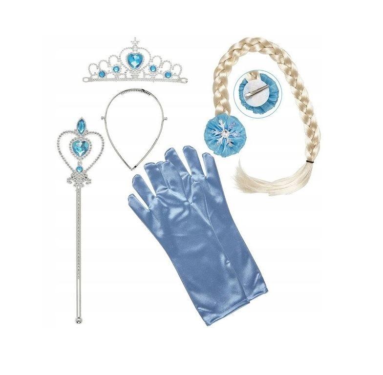 Rękawiczki w kolorze niebieskim wykonane są z materiału o wysokim połysku i sięgają za nadgarstek, dodając stylizacji wyjątkowego uroku. Srebrna tiara z ornamentalnymi zdobieniami posiada serce w centralnej części oraz niebieskie kamyczki, które pięknie się mienią. Różdżka utrzymana jest w tym samym stylu co tiara, dzięki czemu całość prezentuje się spójnie i bajkowo. Zestaw uzupełnia blond warkocz z niebieską ozdobą, mocowany na spinkę, który doskonale komponuje się z tiarą.