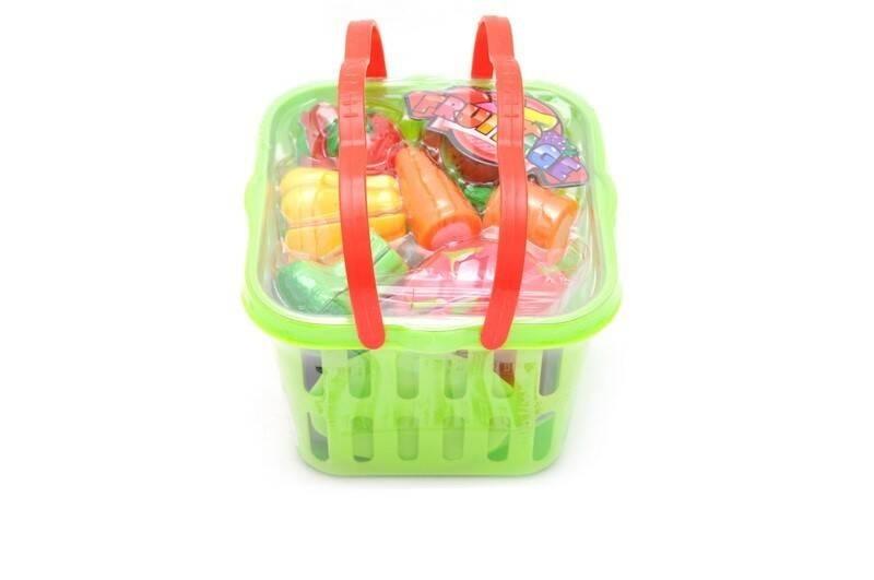 W komplecie koszyk z uchwytem, plastikowe warzywa i owoce.