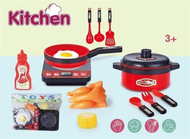 Ten wszechstronny zestaw kuchenny dla dzieci zachęca do wciągającej zabawy i odgrywania ról. Zabawka jest przeznaczona dla dzieci od trzeciego roku życia i pozwala na bezpieczne naśladowanie czynności kuchennych dorosłych. W skład zestawu wchodzi duży czerwono-czarny garnek z pokrywką oraz patelnia z namalowanym jajkiem sadzonym. Realizmu dodaje imitacja płyty indukcyjnej z wyświetlaczem czasu 00:25, co sugeruje wbudowane efekty świetlne lub dźwiękowe. Zestaw zawiera plastikowe jedzenie: całego kurczaka i kolbę kukurydzy, umożliwiając przygotowanie kompletnego posiłku. Dołączone akcesoria to butelka keczupu, trzy przybory do gotowania - łopatka, łyżka wazowa i widelec - oraz zestaw czarnych sztućców dla małego kucharza: nóż, widelec i łyżka. Wszystkie elementy są utrzymane w żywych, bezpiecznych dla dzieci kolorach, głównie czerwonym, czarnym i żółtym. Część akcesoriów jest również zapakowana w przezroczysty worek widoczny na zdjęciu. To doskonała zabawka rozwijająca wyobraźnię i umiejętności społeczne.