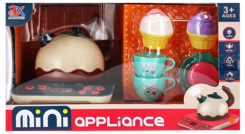 Zalety produktu: czajnik posiada efekty dźwiękowe oraz świetlne- gotowanie wody, wesoła melodia, niebieska lampka, do czajnika dołączona jest kuchenka z płytą grzewczą, płyta posiada efekty dźwiekowe oraz świetlne, przyciski którymi można ustawić programy gotowania, przyciski"+'' i "-" którymi można imitować podnoszenie lub obniżanie temperatury grzania. Czajnik elektryczny MEGA CREATIVE to niezbędny sprzęt w każdym domu! Zawartość zestawu: czajnik, płyta grzewcza, 2 x filiżanki, talerzyk, 3 x babeczki. Całość wykonana z plastiku. Wymiary/waga/baterie: wymiary produktu (dł. x wys. x gł.) [cm]: czajnik-12x11x10, płyta-14x3x18. Wymiary opakowania (dł. x wys. x gł.) [cm]: 33x19x19, waga produktu bez opakowania [kg]: 0,30 kg, waga produktu w opakowaniu [kg]: 0,57 kg. Wymaga zasilania bateriami płyta- 3 x AALR6- nie załączono do zestawu, czajnik-2 x AALR06- nie załączono do zestawu. Zabawka przeznaczona dla dzieci w wieku: 3+.