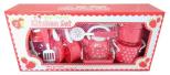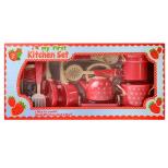 Zestaw plastikowych naczyń akcesoriów do zabawy w kuchnię. Dla dzieci w wieku od 3 lat.