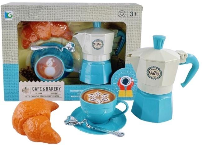 Uroczy zestaw Cafe & Bakery, to fantastyczna propozycja dla każdego małego miłośnika kawiarnianych spotkań i wypieków. Ten bogaty komplet, dedykowany dla dzieci od 3 roku życia, pozwoli im na stworzenie własnego, przytulnego kącika do serwowania kawy i słodkości. Centralnym elementem jest stylowy ekspres do kawy typu moka w modnej, dwukolorowej stylistyce błękitu i kremowej bieli, z napisem Fresh Coffee. Ekspres jest wyposażony w uchwyt i otwierane wieczko, co zwiększa realizm zabawy. Do zestawu dołączona jest filiżanka ze spodeczkiem w identycznym, żywym odcieniu błękitu oraz srebrna, elegancka łyżeczka. Filiżanka kryje niespodziankę: realistyczną piankę kawową z misternym wzorem latte art, co sprawia, że wygląda jak prawdziwa, profesjonalnie przygotowana kawa. Całość dopełnia duży, złocisty croissant, który wygląda wyjątkowo apetycznie i stanowi idealne uzupełnienie kawiarnianego menu. Zabawa tym zestawem rozwija wyobraźnię, uczy ról społecznych oraz ćwiczy zdolności manualne i koordynację wzrokowo-ruchową. Jest to doskonały prezent, który gwarantuje godziny twórczej i bezpiecznej zabawy.