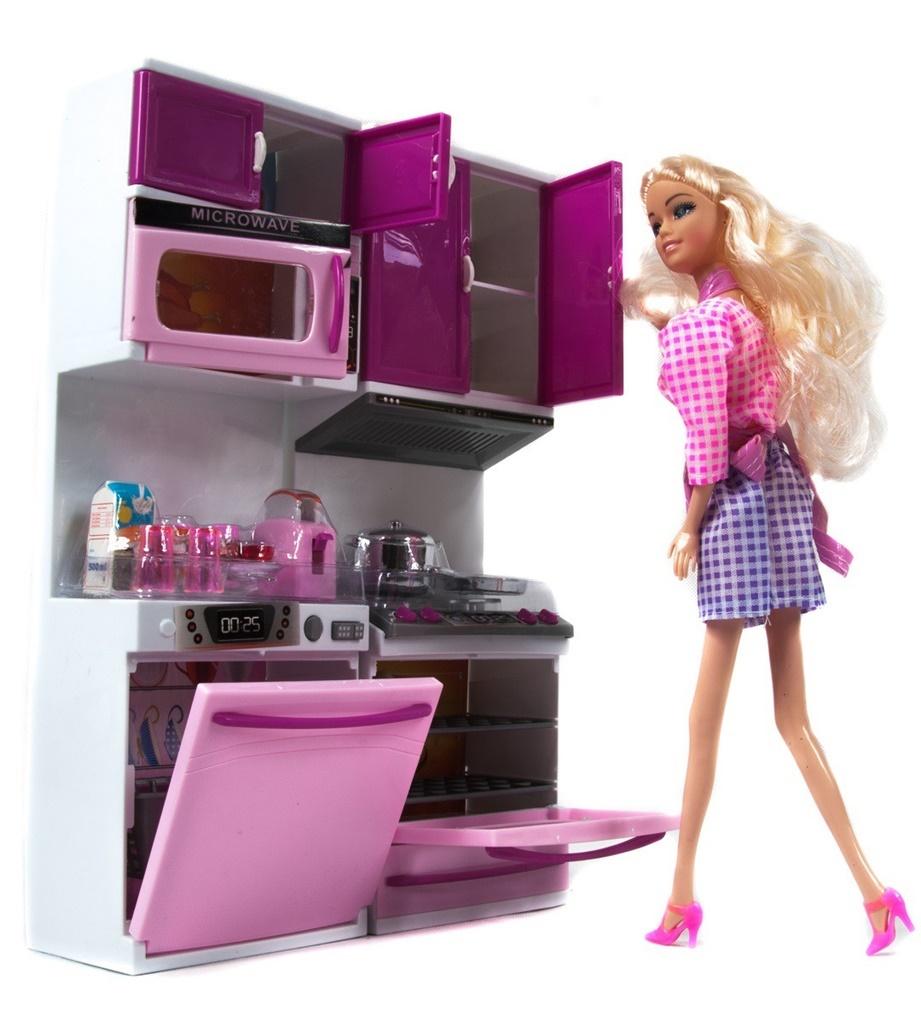 W zestawie widać ciekawe odwzorowanie szczegółów. Zestaw jest bardzo bogaty, co gwarantuje zabawę na bardzo długi czas. Wszystkie części umeblowania są otwierane np. mikrofalówka, szafki, zmywarka. Dodatkowo znajdziemy mnóstwo akcesoriów np. naczynia, garnki i artykuły spożywcze. Piekarnik posiada dodatkowo wbudowaną funkcję - po wciśnięciu przycisku rozlega się dźwięk a piekarnik się świeci. Wspaniała zabawa dla każdej dziewczynki gwarantowana. W skład zestawu wchodzi: - lalka, - zestaw mebli kuchennych, - kuchenka wraz z otwieranym piekarnikiem, - kuchenka mikrofalowa, - zmywarka, - drobne akcesoria kuchenne: garnki, toster, inne przyrządy kuchenne. Kuchenka oraz kuchenka mikrofalowa dodatkowo po naciśnięciu przycisku świeci światło oraz wydaje dźwięk gotowania.