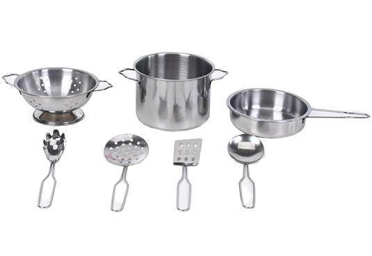 Kompletny zestaw do zabawy w małego kucharza, składający się z 7 elementów wykonanych z wysokiej jakości metalu. Ta realistyczna imitacja prawdziwych naczyń i przyborów kuchennych zapewni godziny kreatywnej zabawy każdemu dziecku. Zestaw zawiera solidny garnek z uchwytami, praktyczną patelnię z długą rączką oraz funkcjonalny durszlak na stabilnej podstawie. Do tego dołączone są cztery podstawowe akcesoria kuchenne: łopatka, łyżka wazowa, łyżka cedzakowa oraz widelczyk do makaronu. Zabawki są bezpieczne i trwałe, a ich metalowa konstrukcja sprawia, że są bardzo podobne do prawdziwych. Zestaw ten doskonale wspiera rozwój wyobraźni, zachęca do odgrywania ról i pomaga w rozwijaniu koordynacji ręka-oko. To doskonały prezent dla każdego małego miłośnika gotowania.
