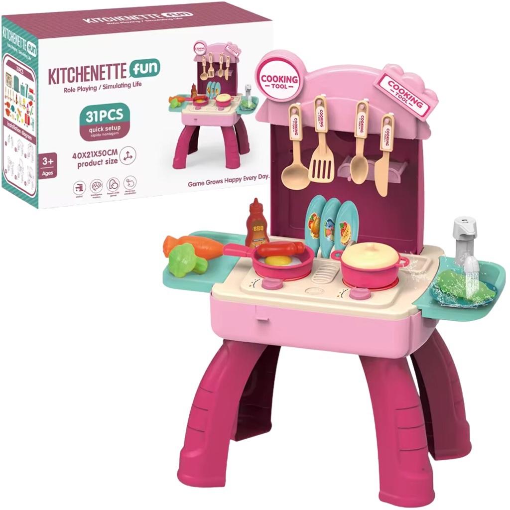Kran z wodą: Kran z wodą dodaje interaktywności do zabawy, umożliwiając dzieciom udawanie codziennych czynności związanych z wodą w kuchni. Możliwość napełniania garnka wodą lub płukania naczyń sprawia, że zabawa staje się bardziej realistyczna i angażująca.