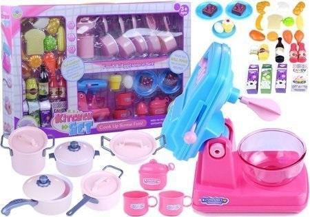 Duży zestaw dla małej pomocy kuchennej Przedstawiony zestaw składa się z pełnego wyposażenia kuchni wykonanego z wysokogatunkowego tworzywa, jakim jest certyfikowany plastik - pozwala to na łatwe czyszczenie i utrzymanie wysokiego poziomu higieny płynącego z korzystania z zabawek. Przyjemne dla oka kolory i dokładne odwzorowanie realnych przedmiotów tylko zachęcają do rozpoczęcia zabawy, stymulując wzrok malucha. Korzystając z tego kompletu, dziewczynki mogą w przyjemny sposób naśladować swoich rodziców, którzy gotują obiady i przyrządzają przesłodkie desery. Zabawkowa kuchnia działa na wyobraźnię dziecka, równocześnie rozwijając jego kreatywność i zdolności manualne. Przemyć do pokoju dziecięcego zabawki imitujące realne przybory i sprzęty kuchenne, a Wasza przygoda dopiero się rozpocznie! Ten zestaw kuchenny składa się z dużej liczby akcesoriów oraz produktów spożywczych, co tylko czyni zabawę lepszą. Wybierając go, możesz mieć pewność, że Twoja pociecha będzie szczęśliwa. Mikser z dołączoną misą jest zabawką, która prawdopodobnie zwróci największą uwagę dziecka. Poruszając różową dźwignią, można w prosty sposób wprawić w ruch ubijaczki do piany. To doskonała możliwość pomagająca zrozumieć małym pomocnikom kuchennym działanie poszczególnych sprzętów. W zestawie małej pomocy kuchennej Twoja pociecha znajdzie: - zestaw różowych garnków i patelni z pokrywkami - 7 sztuk, - mikser, - dwa talerzyki z ciastem, - dwie filiżanki, - przyprawy, - artykuły spożywcze: muffinkę, jajko, rogalika, chałkę, tosta, ser, kukurydzę, brokuła, marchewkę, dynię, ziemniaka, udko z kurczaka, mleko, mleko czekoladowe, wino, przetwory pomidorowe, kartonik cukierków, soku jabłkowego i dwóch o smaku czarnej jagody. Taki zasób akcesoriów pozwoli dziecku na długą zabawę, która z pewnością nie będzie się nudzić. Możecie wspólnie gotować, używając garnków i patelni, a także serwować śniadania czy słodkie podwieczorki. A co powiecie na zabawę w restaurację? Myślimy, że mnogość zabaw z wykorzystaniem plastikowej kuchni ogranicza tylko wyobraźnia dziecka. Warto pamiętać, że ze względu na małe wymiary produktów, zestaw kuchenny przeznaczony jest dla dzieci, które ukończyły trzeci rok życia. Wymiary wybranych elementów: - mikser z misą: 13,5 cm x 15 cm, - filiżanki z uszkami: 5 cm x 8 cm, - największy garnek: 6,5 cm x 12 cm, - patelnia: 17 cm x 3,5 cm, - talerzyk: 10,5 cm, - kartonik soku: 12 cm x 4 cm, - tost: 8 cm x 6 cm, - kukurydza: 9 cm x 3,5 cm, - wino: 11,5 cm x 4,5 cm. Wymiary opakowania: - 45 cm x 67,5 cm x 11 cm.