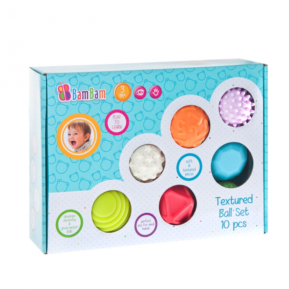 10 ELEMENTOWY ZESTAW KUL SENSORYCZNYCH  to absolutnie więcej aniżeli zabawka edukacyjna. Odmienne rodzaje wypustek, w tym w formie stożków, gwiazdek czy cyferek,  zapewnią dziecku różnorodność i dostarczą zróżnicowane doznania dotykowe. Urozmaicona faktura i kolorystyka są impulsem dla zmysłu wzroku oraz zmysłu dotyku, aktywizując jego receptory czuciowe. Zabawki sensoryczne gwarantują wszechstronny rozwój dziecka, które poprzez zabawę doskonali koordynację pomiędzy świadomym chwytaniem a widzeniem, a także usprawnia zdolności manualne. Wymiary/waga/baterie: wymiary produktu (śr.)[cm]: 7-6 cm, wymiary opakowania (dł. x wys. x gł.)[cm]: 31x8x23, waga produktu bez opakowania [kg]: 0,31 kg, waga produktu w opakowaniu [kg]: 0,56 kg, nie wymaga zasilania bateriami. Zestaw przeznaczony dla dzieci w wieku: 6m+. Pakowany w kartonik z okienkami.