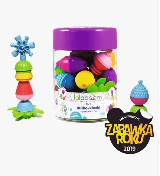 Zestaw kulko - klocków Lalaboom składający się z 48 elementów dostarcza wiele zróżnicowanych wrażeń dotykowych ze względu na różne faktury poszczególnych elementów. Zabawka daje możliwość ćwiczenia ruchów obrotowych nadgarstka, rozwija chwyt pęsetkowy (przeciwstawienie kciuka palcowi wskazującemu) i precyzyjne ruchy ręki przy nawlekaniu (rozwija małą motorykę i koordynację wzrokowo-ruchową). Zabawka wspiera ćwiczenie koordynacji wzrokowo-ruchowej