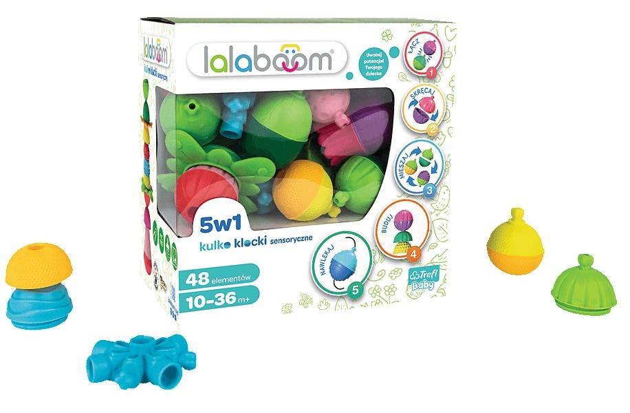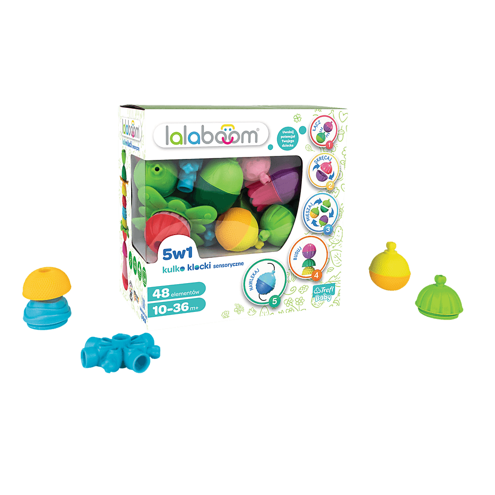 Zestaw kulko - klocków Lalaboom składający się z 48 elementów dostarcza dzieciom wiele zróżnicowanych wrażeń dotykowych ze względu na różne faktury poszczególnych elementów. Zabawka daje możliwość ćwiczenia ruchów obrotowych nadgarstka, a także rozwija chwyt pęsetkowy (przeciwstawienie kciuka palcowi wskazującemu) i precyzyjne ruchy ręki przy nawlekaniu. Zestaw rozwija małą motorykę i koordynację wzrokowo-ruchową oraz wspiera ćwiczenia koordynacji. Dla dzieci w wieku od 10 miesięcy
