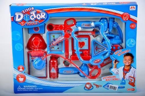 Plastikowy zestaw lekarski, w kolorze niebiesko-czerwonym. Zestaw zawiera m.in stetoskop, strzykawkę, otoskop, termometr. Z tej samej serii dostępne również inne zestawy.