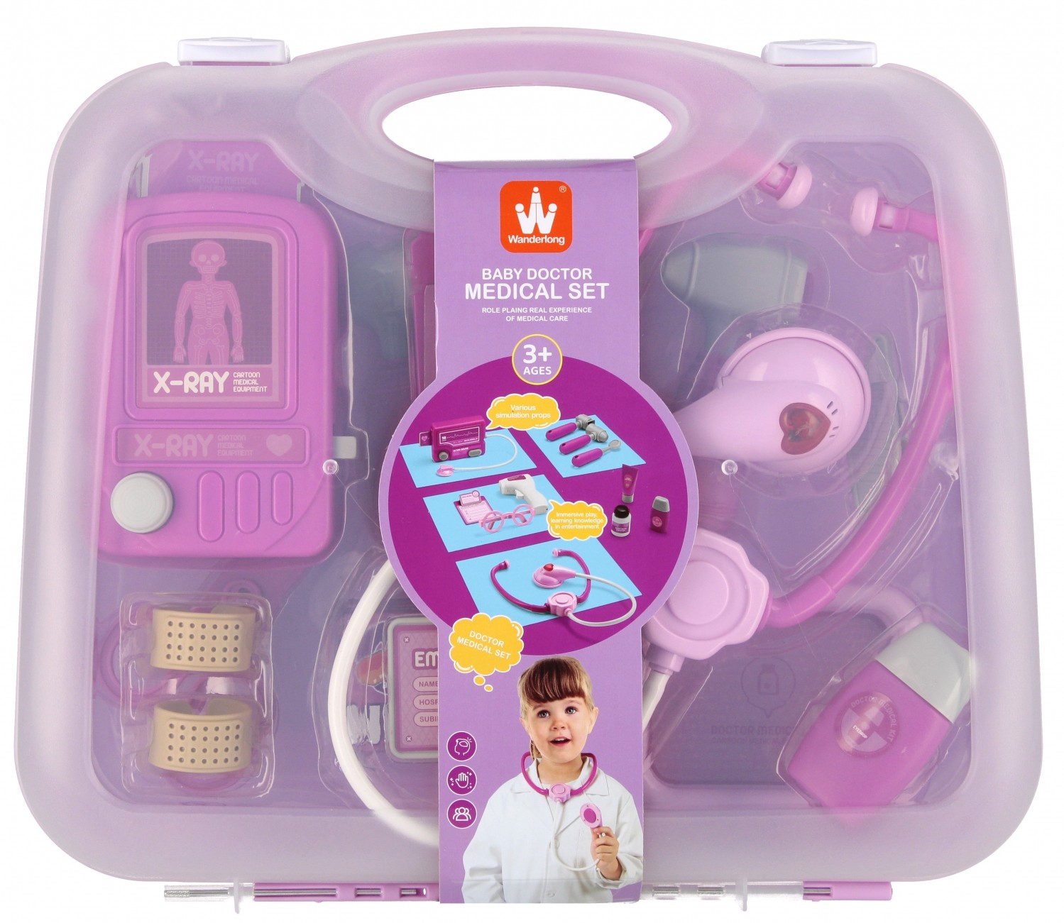 W praktycznej walizeczce znajdują się kolorowe akcesoria medyczne, takie jak stetoskop, termometr, strzykawka, młoteczek czy lusterko, które pozwalają dziecku wcielić się w rolę prawdziwego lekarza.