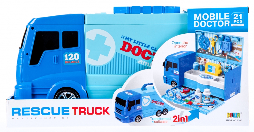 Całość zapakowana w poręczną walizeczkę w kształcie Auta. Zawartość zestawu: stetoskop, okulary, nożyczki, termometr, lusterko, ciśnieniomierz, umywalka z kranem oraz pudełeczka z lekami.