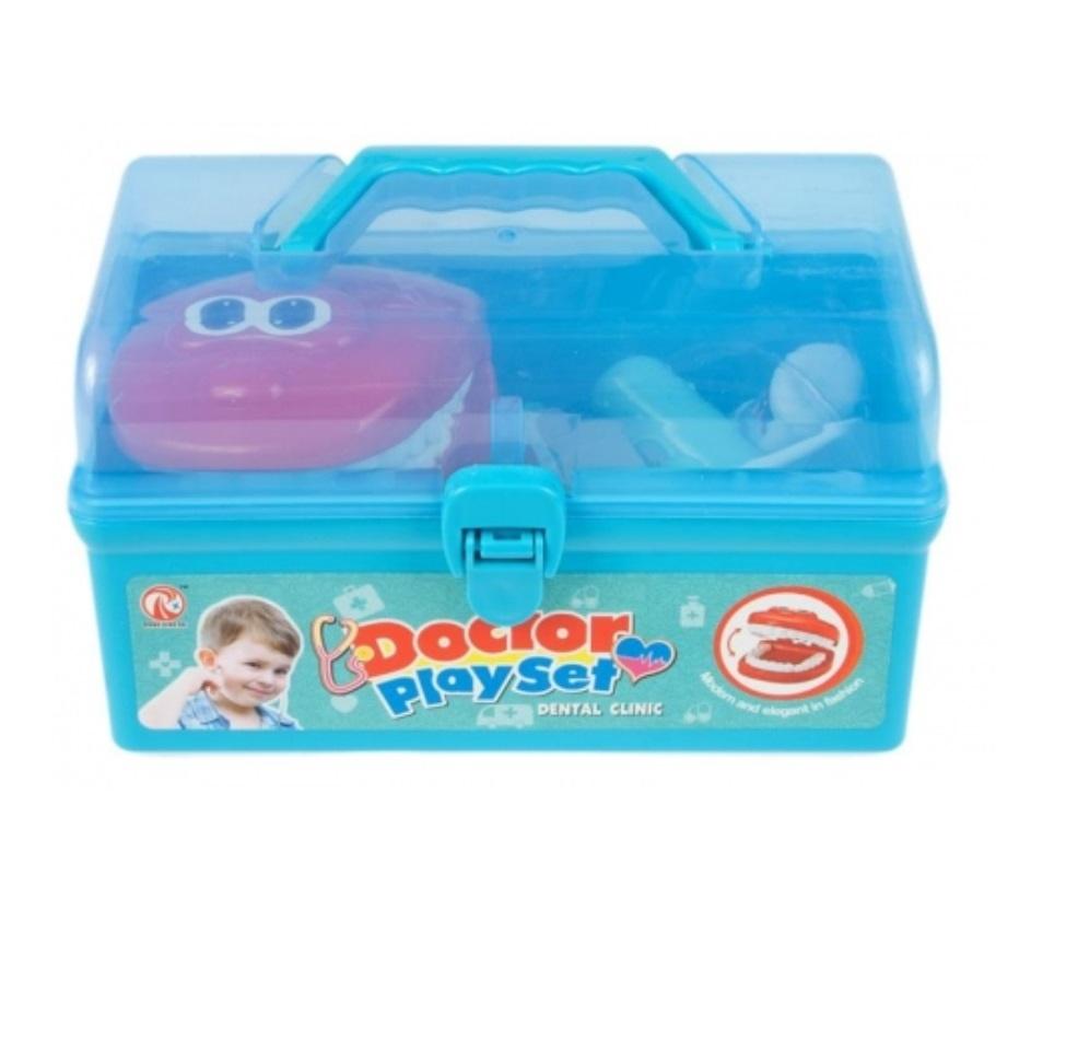Wieloelementowy zestaw małego dentysty w niebieskiej skrzyni.