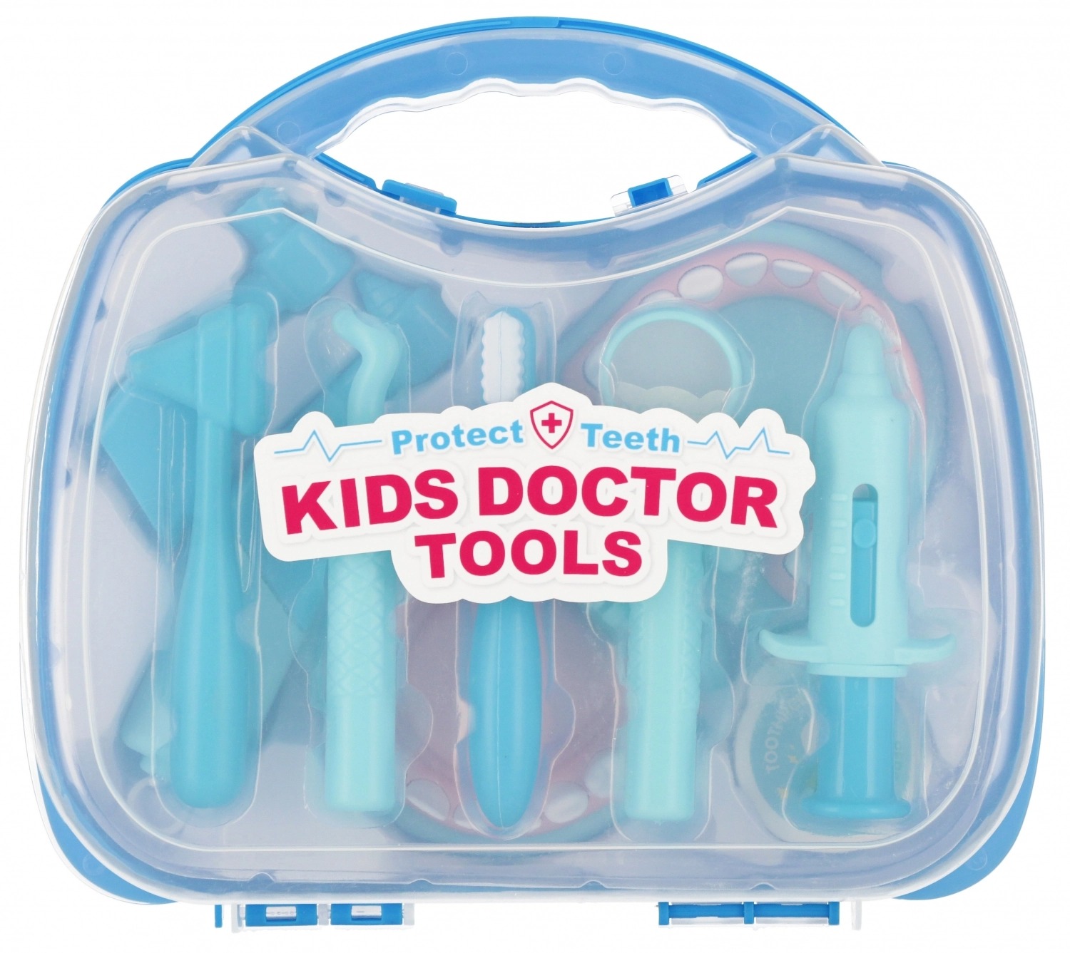 Zawartość zestawu: szczęka, szczoteczka do zębów, lusterko dentystyczne oraz inne niezbędne narzędzia dentystyczne, strzykawka, wiertło. Całość wykonana z plastiku. Wymiary/waga/baterie: wymiary produktu (dł. x wys. x gł.)[cm]: szczęka 10x7x10,
