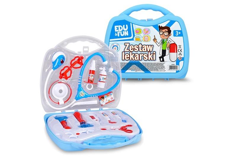 W zestawie: stetoskop, okulary strzykawka, butelka z tlenem, 3x szczypce, termometr, 2x młoteczek, pudełeczko leków, 2x narzędzia lekarskie.